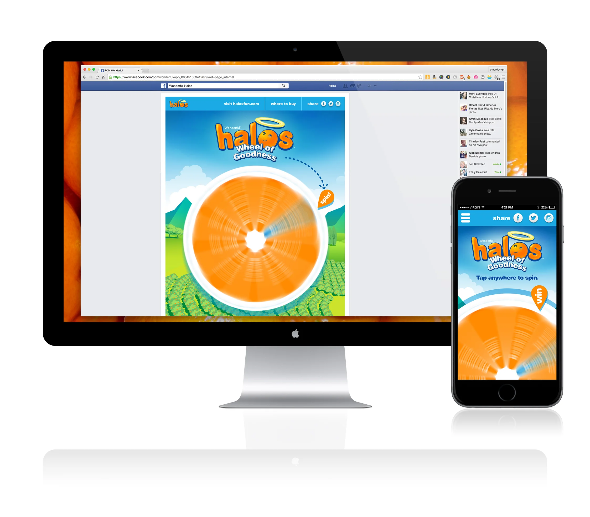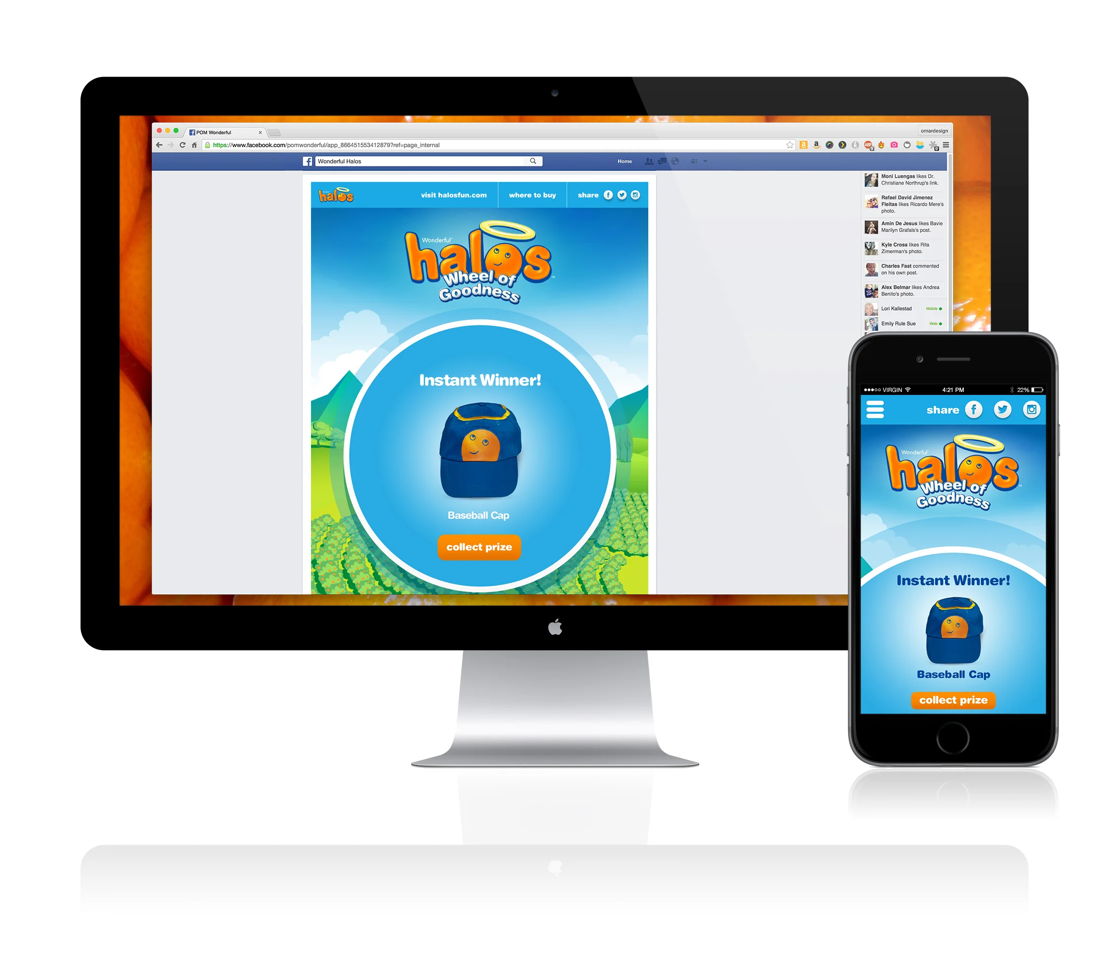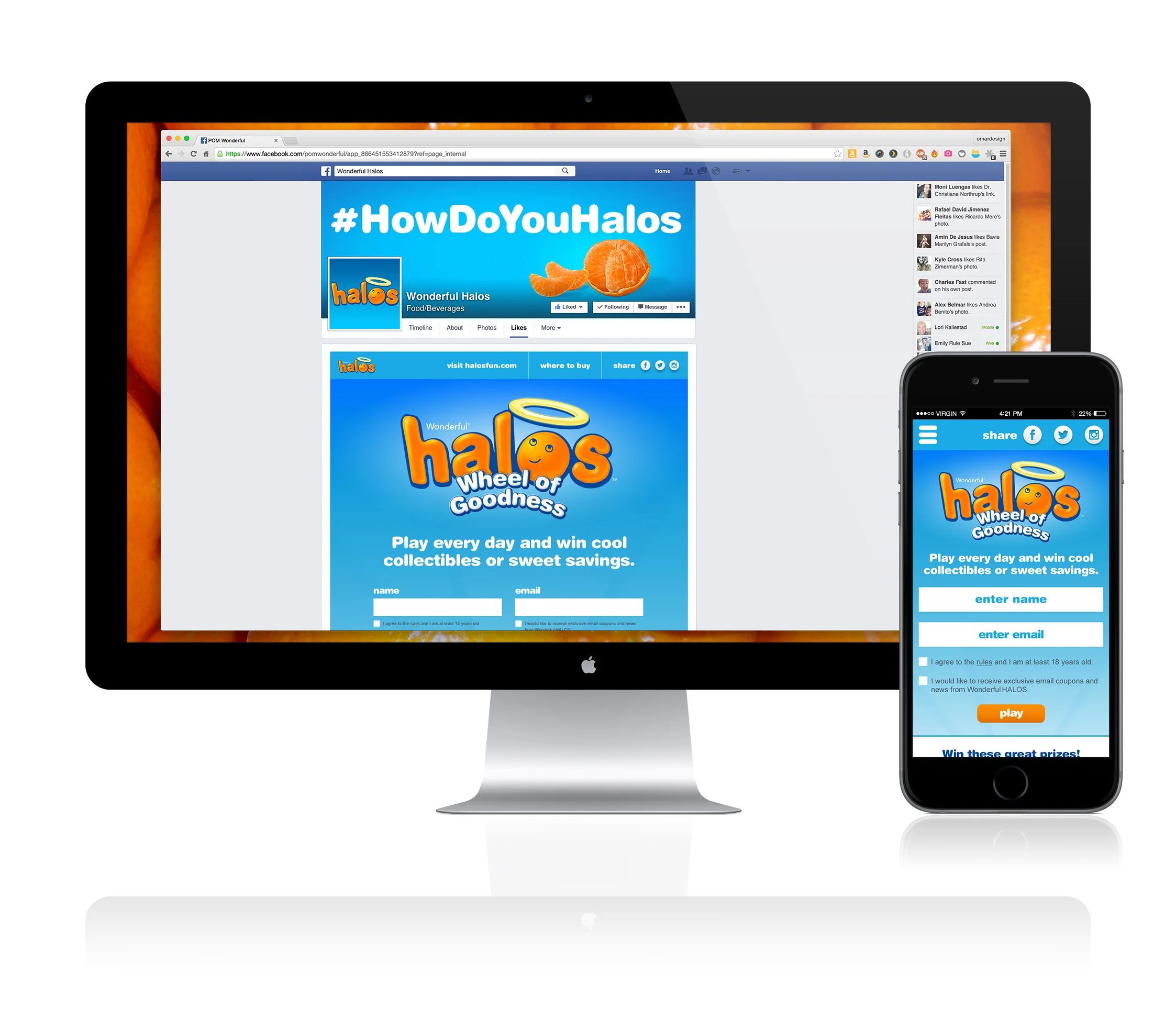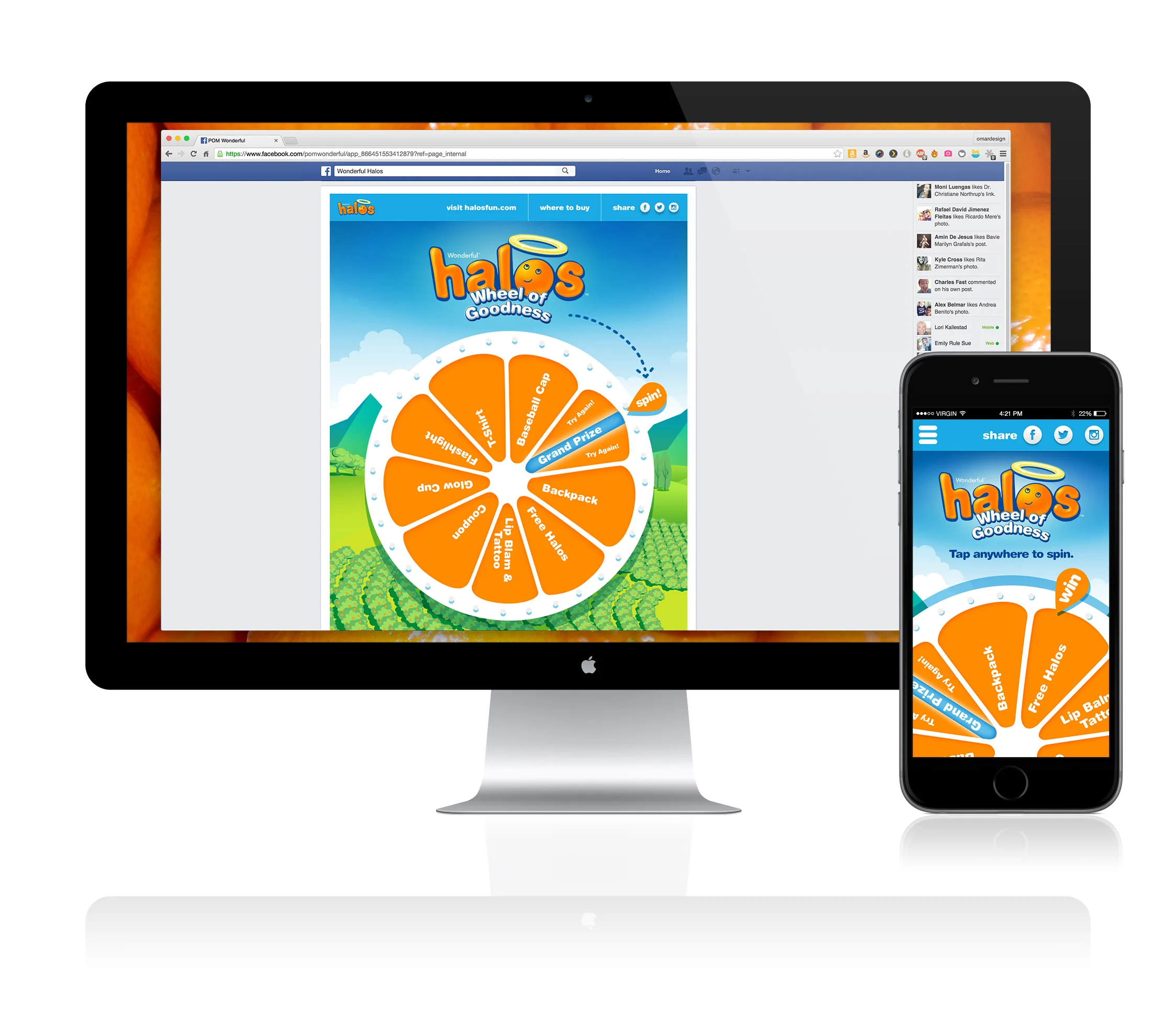 In an effort to boost awareness and sales during the last couple of months of the crop season Wonderful Halos launched a new online sweepstakes game. Halos Wheel of Goodness is a fun game where users can spin a wheel to win daily prizes. Users get one spin per day after entering their name and email, adding more users to the Halos fans database. I had to create not only the Facebook sweepstakes but also the mobile friendly site for a seamless user experience.